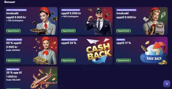 Vi bruker en strukturert bonusplan, slik at du forstår hva du får på hvert trinn og hva som kreves for å gjøre det om til kontanter. Vilkårene for din WinAirlines bonus er alltid lenket i kampanjeområdet, inkludert omsetningskrav og eventuelle regler for spillvekting som gjelder. Hvis du spiller fra Norge, er hovedtilbudene våre satt i NOK og utformet rundt et lavt minimumsinnskudd. Sjekk alltid utløpstiden for bonusen i kontoen din før du begynner å omsette.